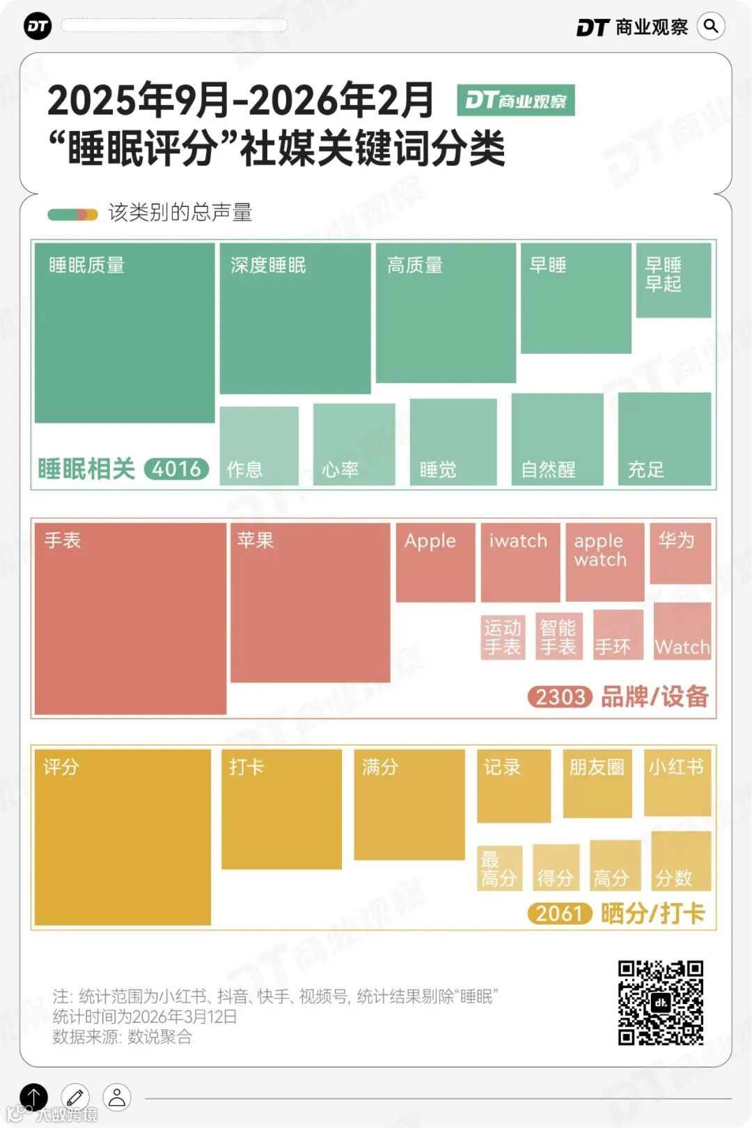 在社交媒体关于“睡眠评分”的讨论中,围绕睡眠本身的内容占比最高。“睡眠质量”“深度睡眠”“高质量”等关键词高频出现。