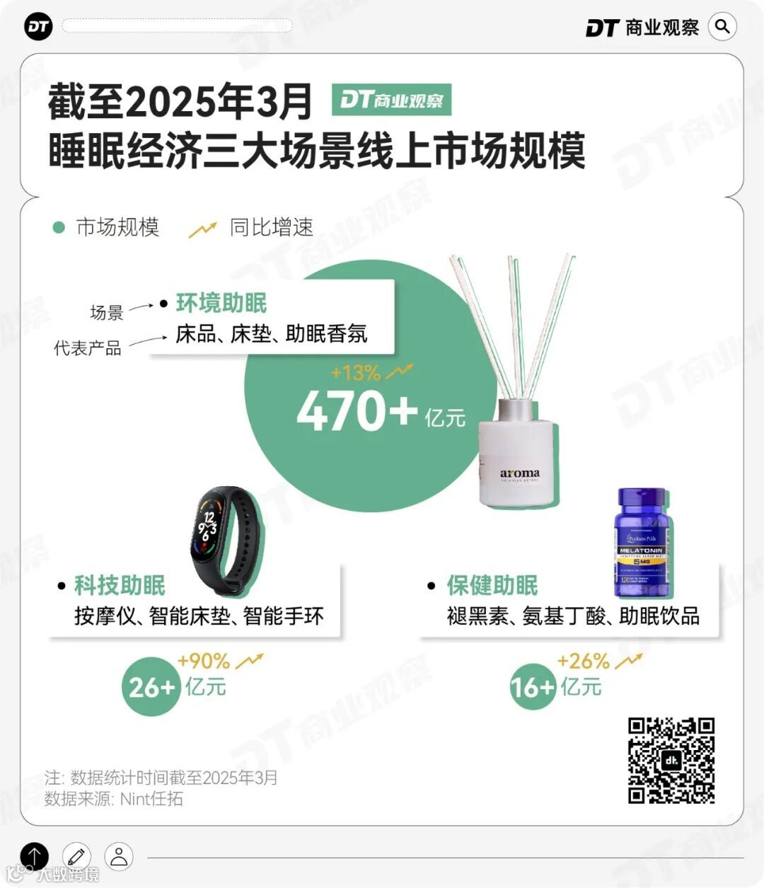 在此背景下,“睡眠经济”快速扩张。据任拓数据,截至2025年3月,国内线上睡眠经济规模已超500亿元,主要分为三条路径: