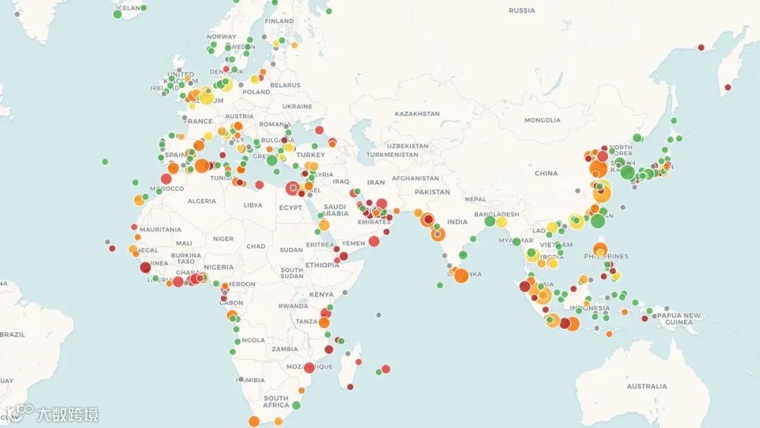 Xeneta每日更新发布的港口拥堵地图可供业界参考:Xeneta港口拥堵服务地图。(拥堵率计算公式为:等待船舶数量除以港口在泊船舶与等待船舶之和。需要说明的是,堆场利用率数据未纳入此项计算,且Xeneta亦不对外提供该类数据。)