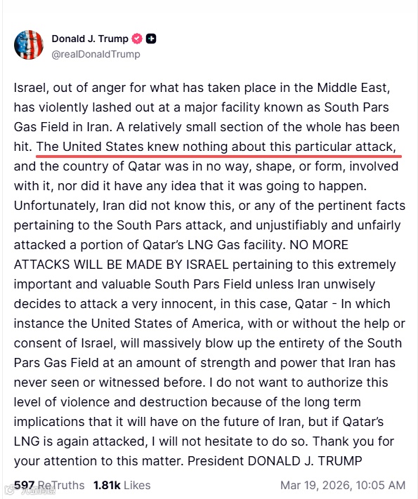 美国总统特朗普3月18日在社交媒体上称,美国对以色列袭击伊朗油气设施“毫不知情”,卡塔尔也没有以任何形式参与袭击。