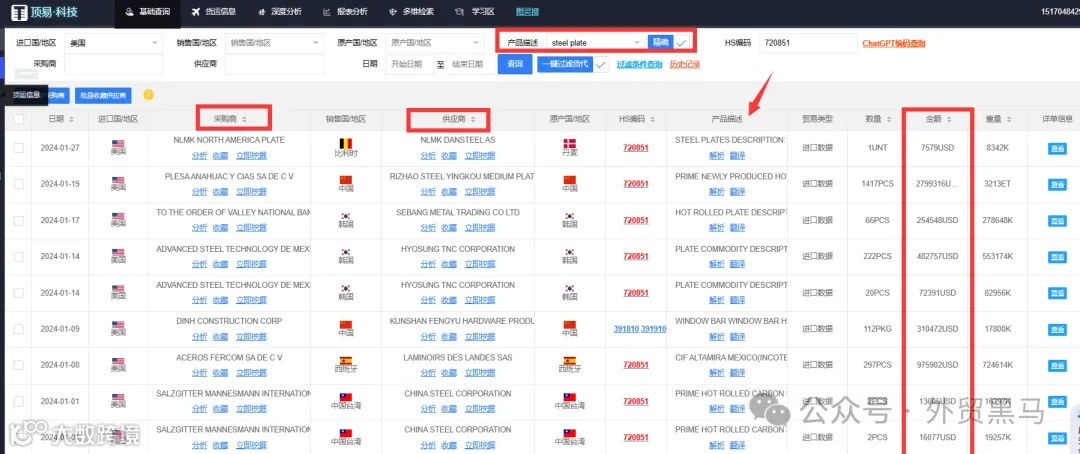 可产品搜/hs编码搜/公司搜,直接查询供应双方公司名称、采购价格、频次,分析贸易采购习惯,判断买家规模,带联系方式