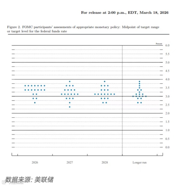 备受关注的利率点阵图,更是向市场释放了明确的偏鹰信号。19位FOMC成员普遍预计2026年仅降息一次,2027年再降息一次至3.1%左右的长期中性水平;值得注意的是,反对年内降息的成员从去年12月的6人增至7人,尽管暂无官员预计今年加息,但已有1位官员预判2027年可能加息。而在中东冲突爆发前,市场曾预期今年有两次降息,如今这一预期已彻底落空,降息窗口被大幅延后。