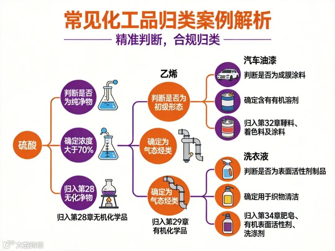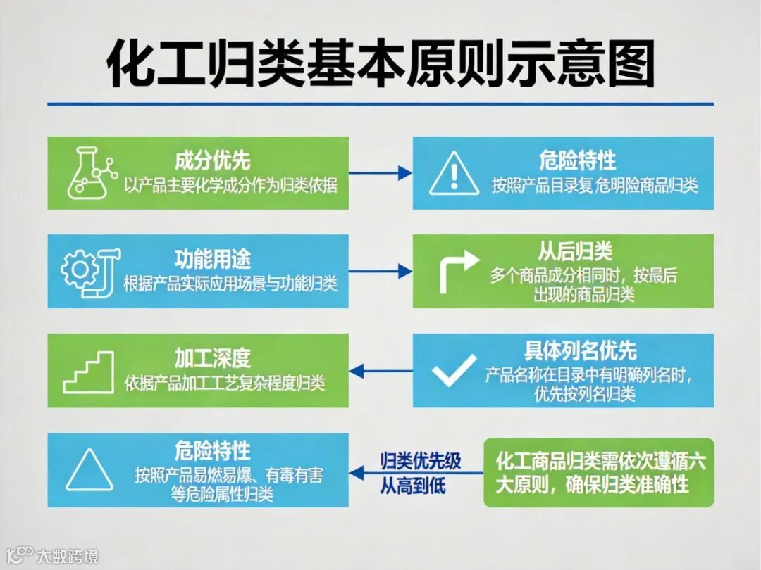 Q:化工中间体如何归类? A:关键看是否已有“特定用途”。如果已经是某化学反应的中间产物,且有明确化学结构,按该结构归类;如果还是通用原料,按原料归类。