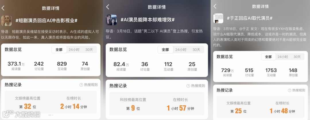 与此同时,#短剧演员回应AI冲击影视业#、#AI演员能降本却难增效#、#于正回应AI取代演员# 等多个相关话题接连登上热搜,引发业内讨论。