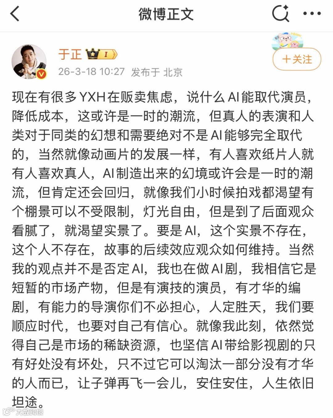 3月18日上午,制片人于正发微博回应了这场讨论。在他看来,一些营销号在炒作AI取代演员的话题,制造焦虑。他认为AI可能是一时的潮流,但观众对真人表演和真人故事的需求,不是AI能替代的。