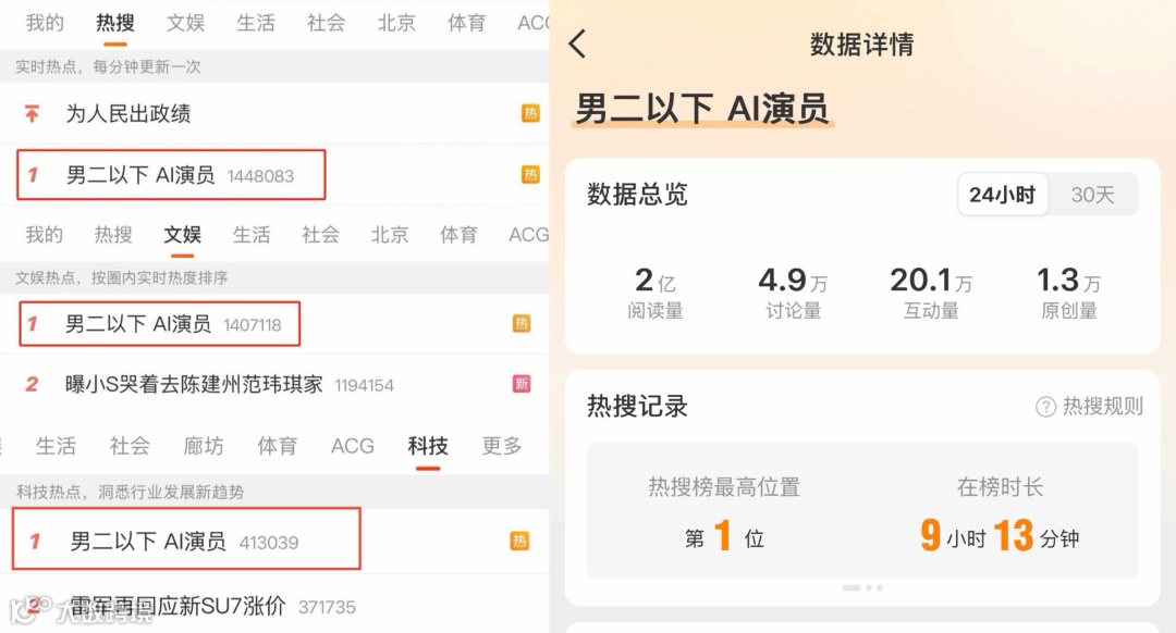 3月18日,话题#男二以下AI演员# 登上热搜,一度冲到微博总榜、文娱榜、科技榜三榜第一,截至目前累计阅读量达2亿次。