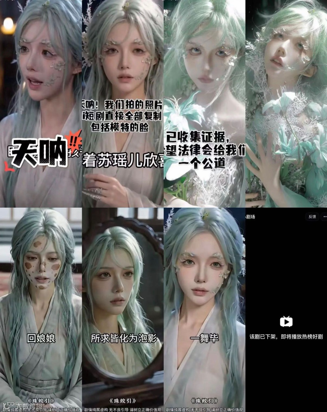 一部播放量超2300万的AI生成短剧《鲛珠引》被指盗用摄影师原创作品的模特形象与妆造。模特马女士表示,剧中造型是她和摄影师原创设计,衣服头饰都是自己做的,看到剧里出现自己的脸才发现被盗用。目前该剧已被平台下架,马女士已固定证据准备起诉。