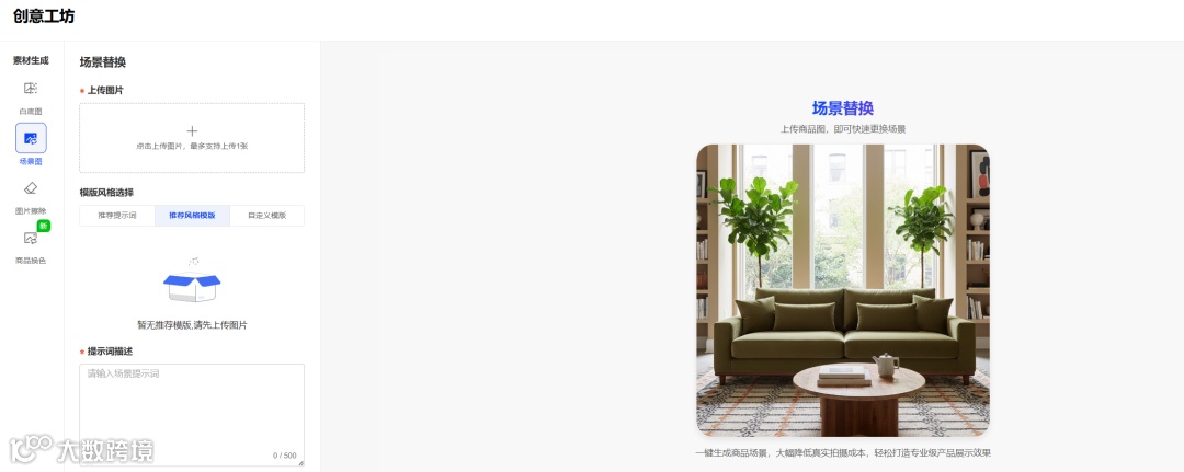 怎么用:上传你的商品白底图,系统会自动推荐模板。选一个喜欢的,点击生成。通常30秒,一张媲美专业影棚的场景大片就出来了。家具、家居园艺等类目,加了场景尺寸图的商品,转化能提升6%。