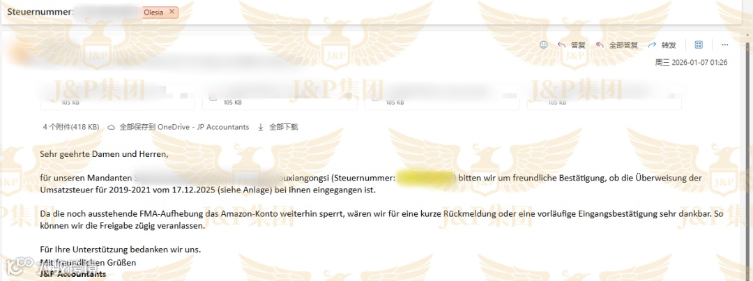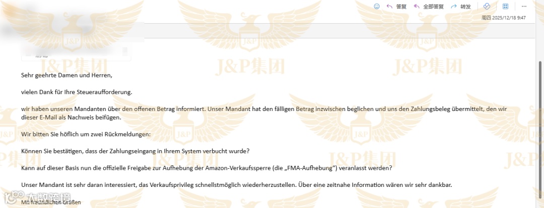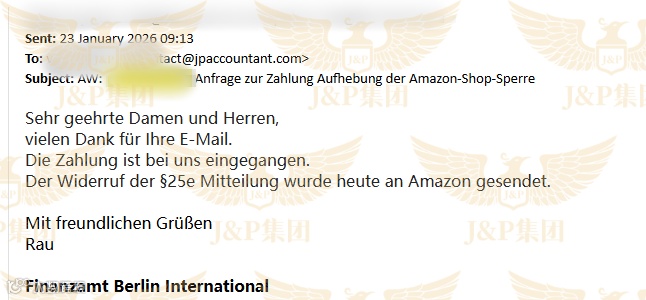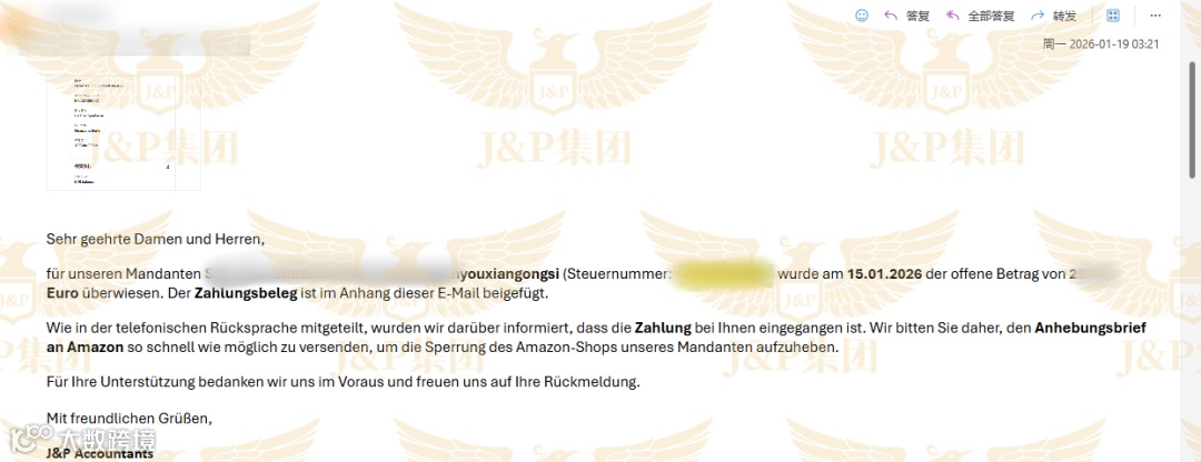 2026年1月7日,税局通知新增一笔1.6万欧元的罚款,客户当日支付。J&P随即要求税局出具解封信。