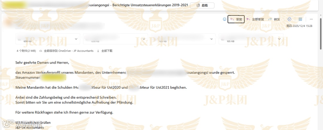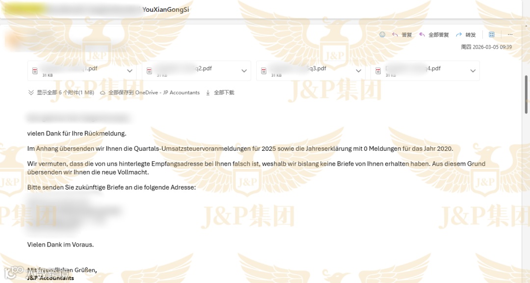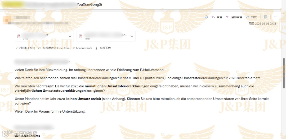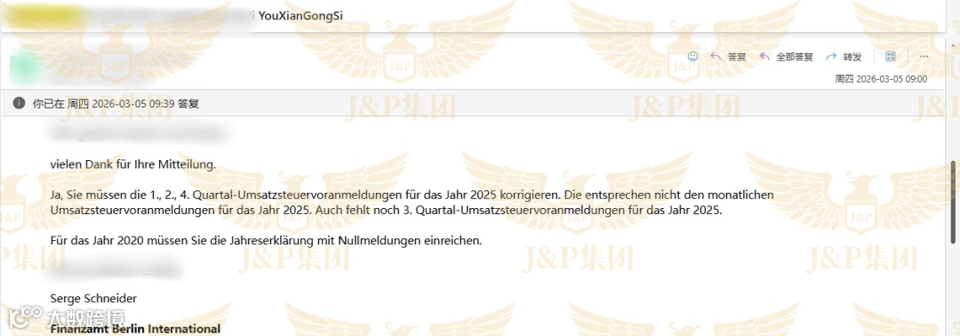 J&P团队没有等待,在接到客户的求助后,立即同步行动:一方面向税局发送正式问询邮件;另一方面,凭借对德国税局工作流程的熟悉,当天直接致电税局,进行人工沟通。