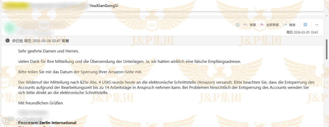 2026年3月3日,一位德国站卖家紧急联系J&P集团,反馈其亚马逊店铺突然被封禁,无法继续销售。根据卖家提供的亚马逊平台通知邮件显示: