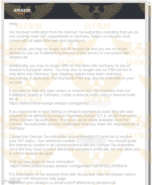 "亚马逊收到德国税务机关的通知,表明卖家目前不符合在德国的增值税要求,因此卖家不能再在Amazon.de上销售商品,并且不再被允许使用亚马逊FBA服务与Amazon.de相关联。"
