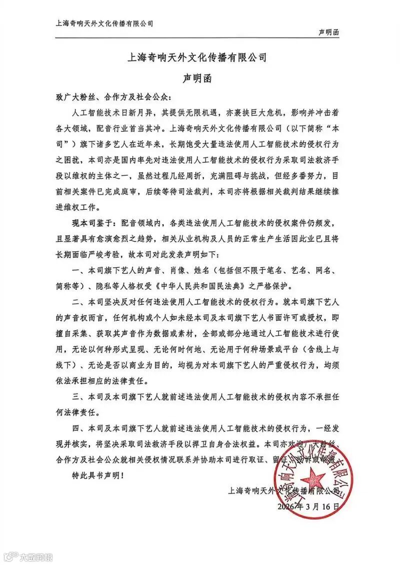 二、本司坚决反对任何违法使用人工智能技术的侵权行为。就本司旗下艺人的声音权而言,任何机构或个人如未经本司及本司旗下艺人书面许可或授权,即擅自采集、获取其声音作为数据或素材,全部或部分地通过人工智能技术进行合成、模仿、转换、生成、传播、使用,无论是否用于商业目的、线上线下场景或呈现形式,均视为严重侵权行为。