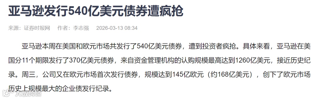 就在这两天,亚马逊正式宣布发行高达540亿美元的债券,不仅在美国市场狂揽370亿美金,还在欧洲市场首次发行了145亿欧元的债券,直接创下了欧元市场企业债的历史纪录。整个金融市场直接炸了,认购订单一度冲到1260亿美金,抢都抢不到 。