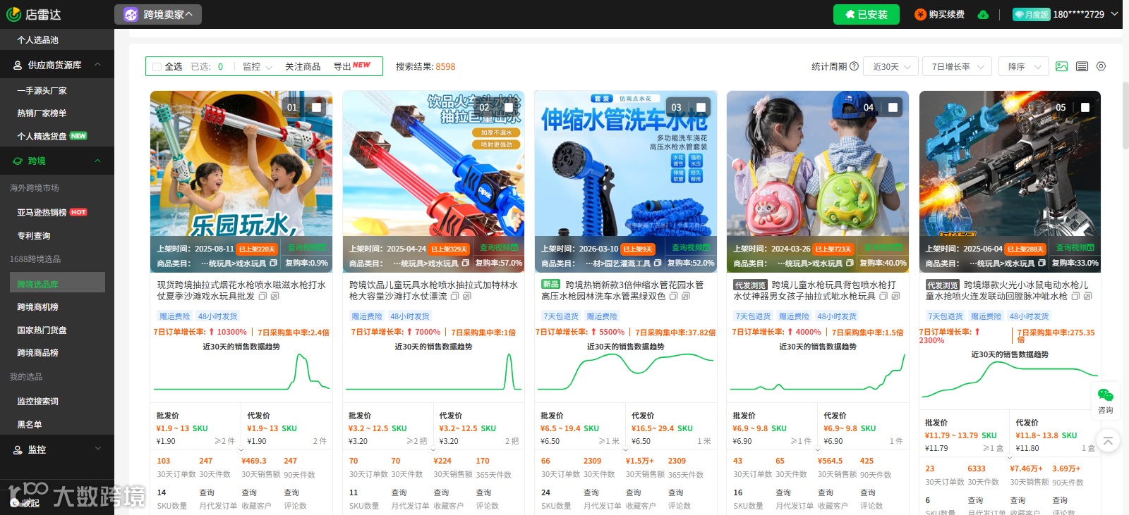 新手可以通过店雷达选品工具,进入 1688 跨境选品库,选择目标类目或输入商品关键词(如水枪),精准筛选下游主营平台为lazada、虾皮等,快速匹配符合目标市场的跨境商品,再根据批发价、近30天的销售趋势等选择货源。