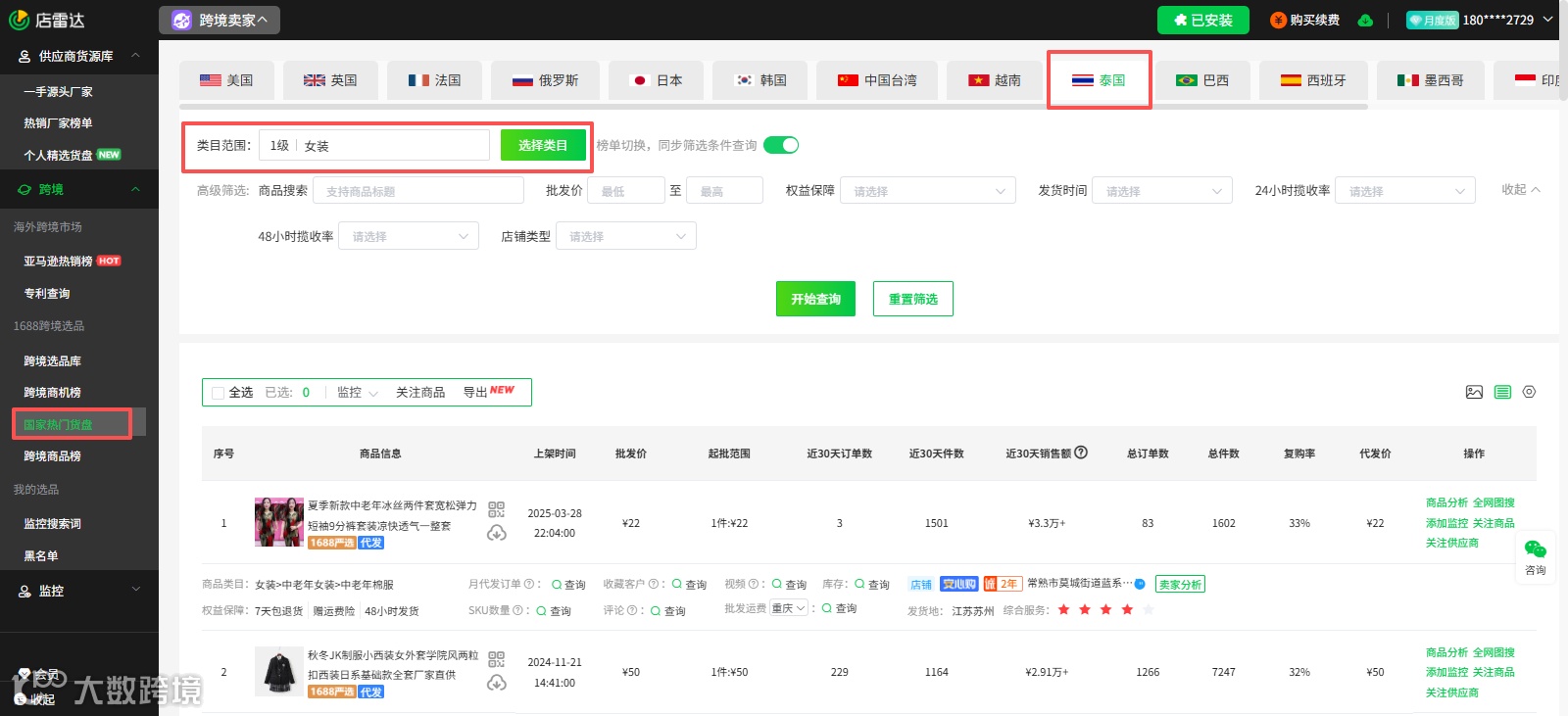 此外还可以再店雷达国家热门货盘中,找到泰国站,查看近期用户在 1688 上下单的热销货源数据,这些真实的采购订单,能精准反映泰国等下游市场的真实消费需求,帮你快速捕捉当下热门趋势,高效获取跨境选品灵感,大幅降低选品试错成本。