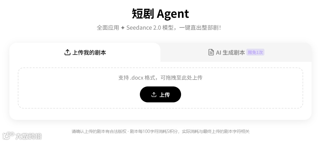 从UI设计来说,初始界面支持直接上传“.docx”格式的剧本,也可以通过输入一句话的故事构想,现场用AI生成剧本,再没有其他花里胡哨的按钮,简直清新脱俗。
