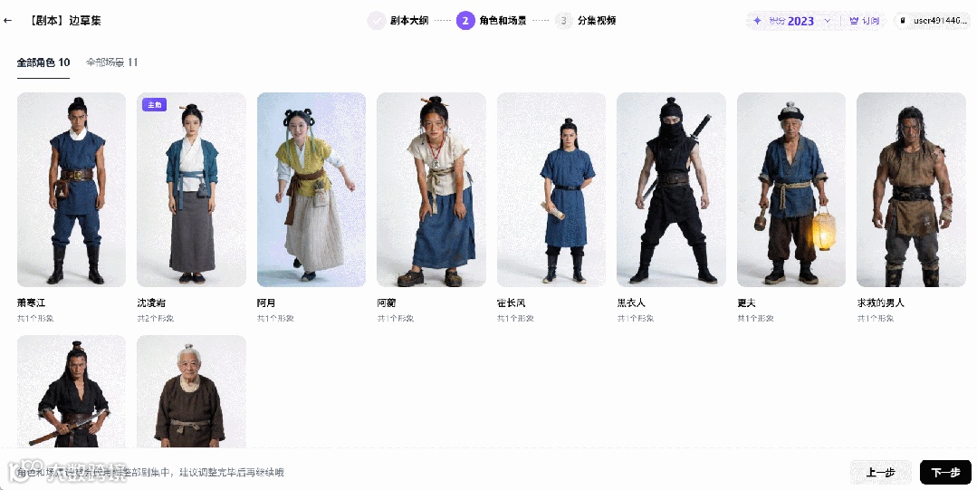 一口气生成的10个主要角色,均标注了出镜场次,只有2位的服装需要微调,相当于把这部分前期准备工作从小时级压缩到分钟级。