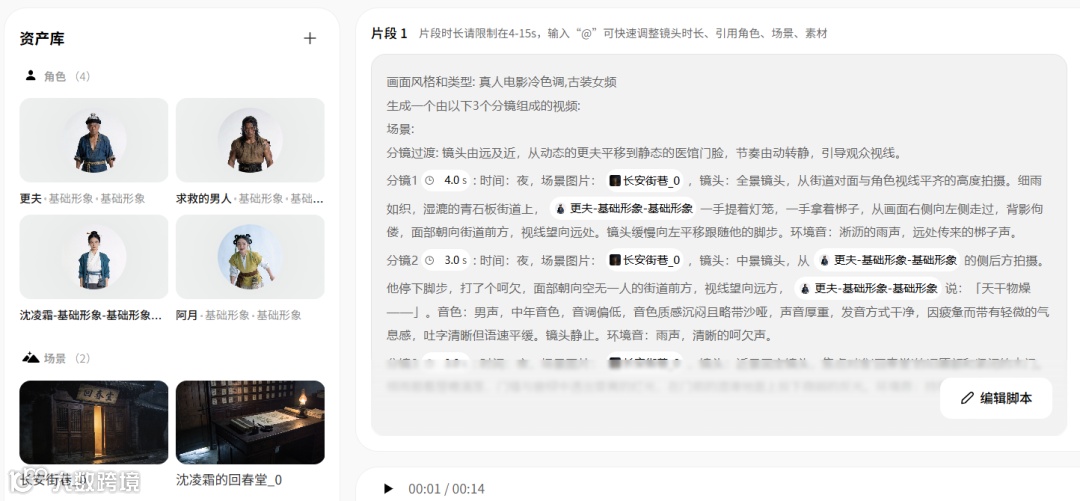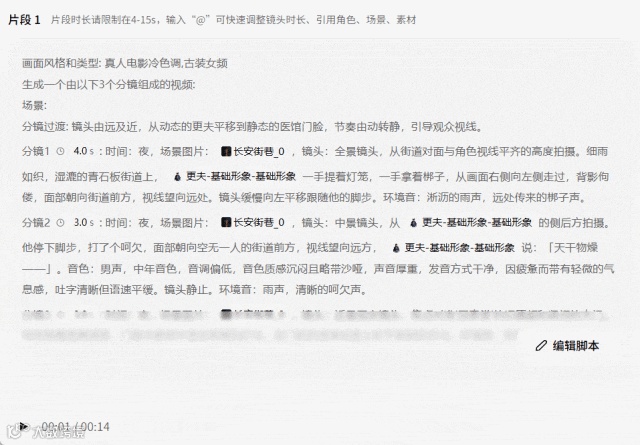想修改参演角色主体、场景等细节,不需要输入资产名称或@相关资产,鼠标点击选择即可;想修改镜头时长,也不需要费劲儿找,每个分镜都设置了可填写的位置。
