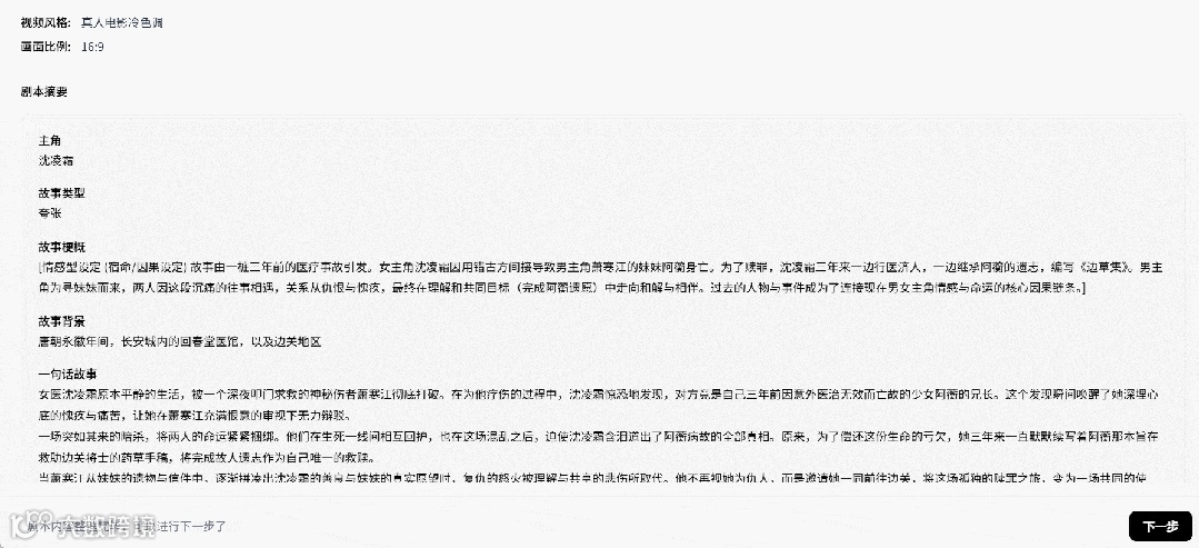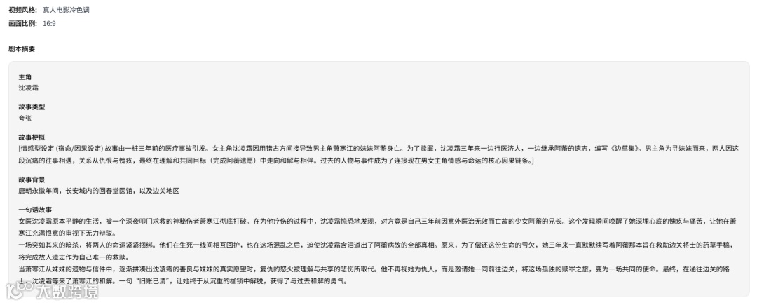 结果上,只看“一句话故事”的概述,对剧本、人设的解读基本准确,女主角沈凌霜的医者身份、心理活动、人生经历都提炼得恰好,甚至剧本中前一集“受伤的神秘男子”也能与下一集出现的男主角萧寒江对上号。