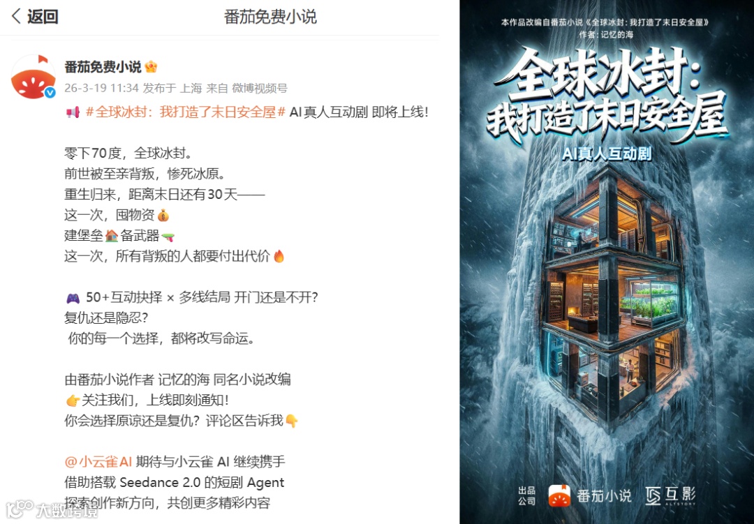 同时,由番茄小说出品、小云雀AI技术支持的《全球冰封:我打造了末日安全屋》也宣布即将上线,这部AI互动真人剧改编自番茄小说作者记忆的海的同名小说,相关PV目前已经发布。