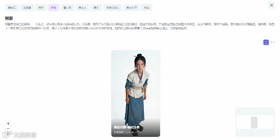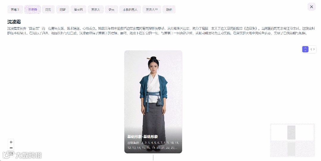 这些原本需要人工梳理的人设细节,如今小云雀AI已经能自动理解出来,并生成差异的服化道,只需要在角色界面的画布上拖动即可查看,还可以点击照片上的“+”按钮,添加更多场景的角色形象。