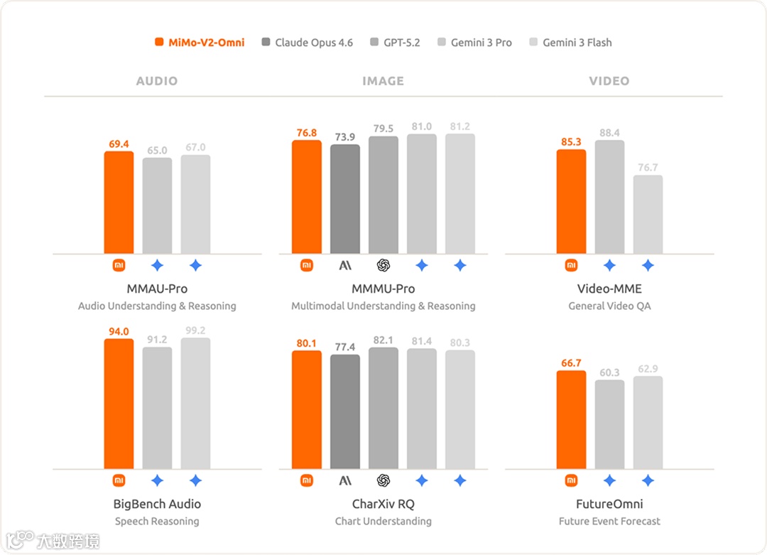 在图像理解方面,MiMo-V2-Omni 展现出强大的多学科视觉推理与复杂图表分析能力,官方称其效果已经超过 Claude Opus 4.6,逼近 Gemini 3 Pro 等顶尖闭源模型。 -