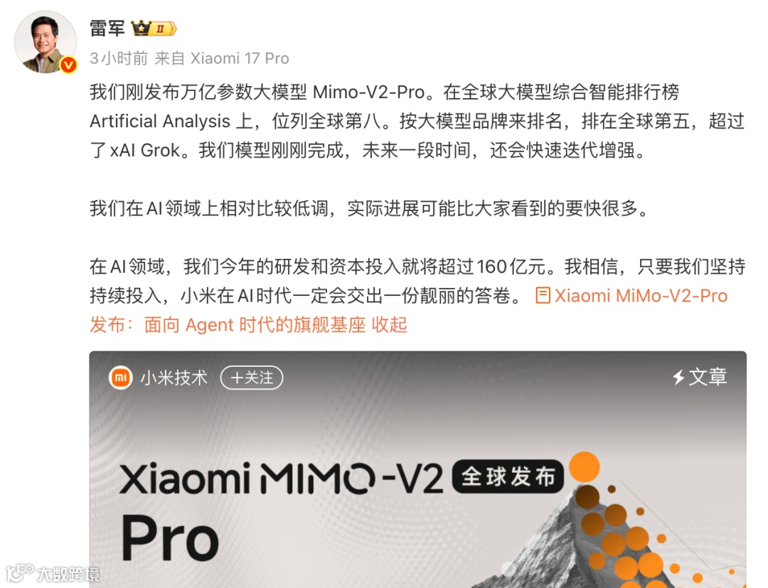 这次发布,雷军也亲自为新品站台。他表示,MiMo-V2-Pro 的榜单表现已经超过马斯克旗下 xAI 的 Grok,并直言:“我们在 AI 领域一直相对比较低调,但实际进展可能比大家看到的要快很多。在 AI 领域,我们今年的研发和资本投入将超过 160 亿元。”