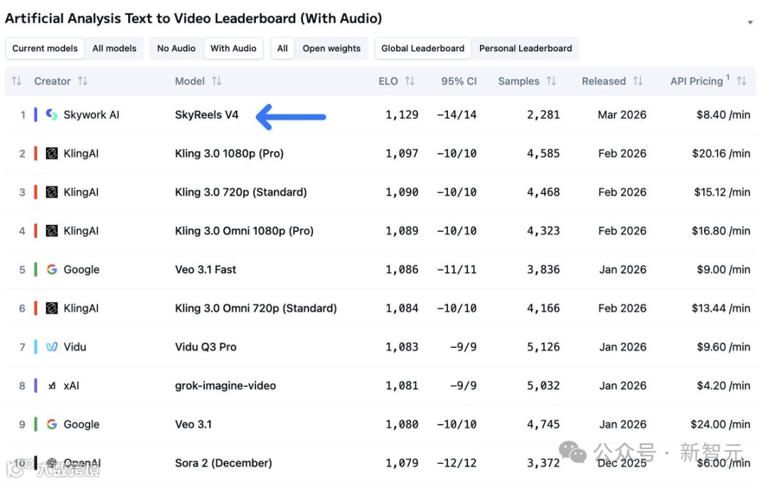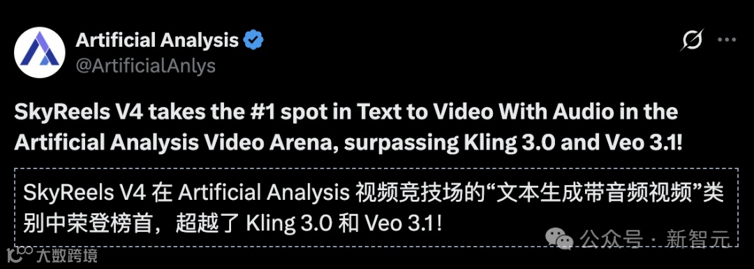 就在刚刚,第三方机构 Artificial Analysis 最新榜单里,SkyReels V4 拿下了「文本生成视频(含音频)」全球第一!