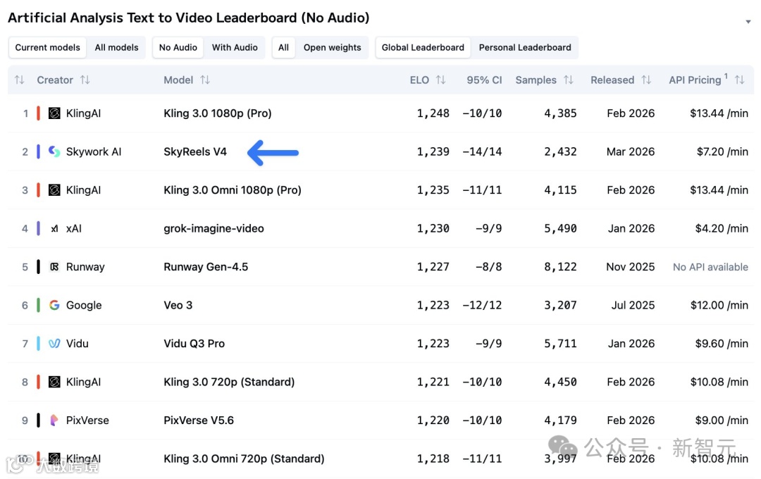 2月27日,SkyReels V4 Preview首次亮相时,已经拿到全球第二。