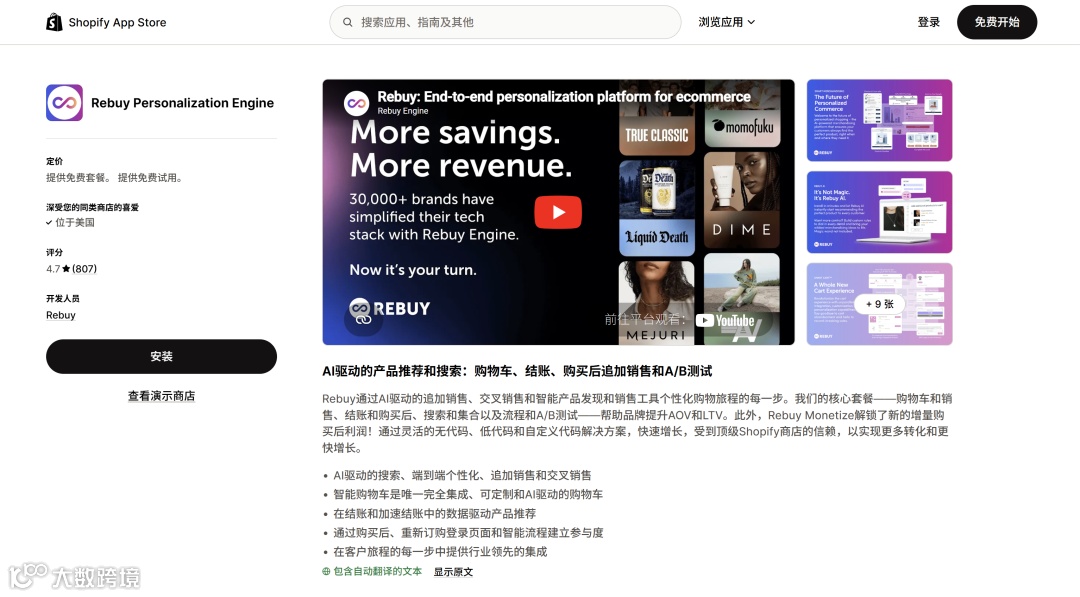 Rebuy 是目前名气最大的,因为它管得宽。从客户进站、加购、结账,到付完款后的 Thank-you 页面,它都能冒出来推销。