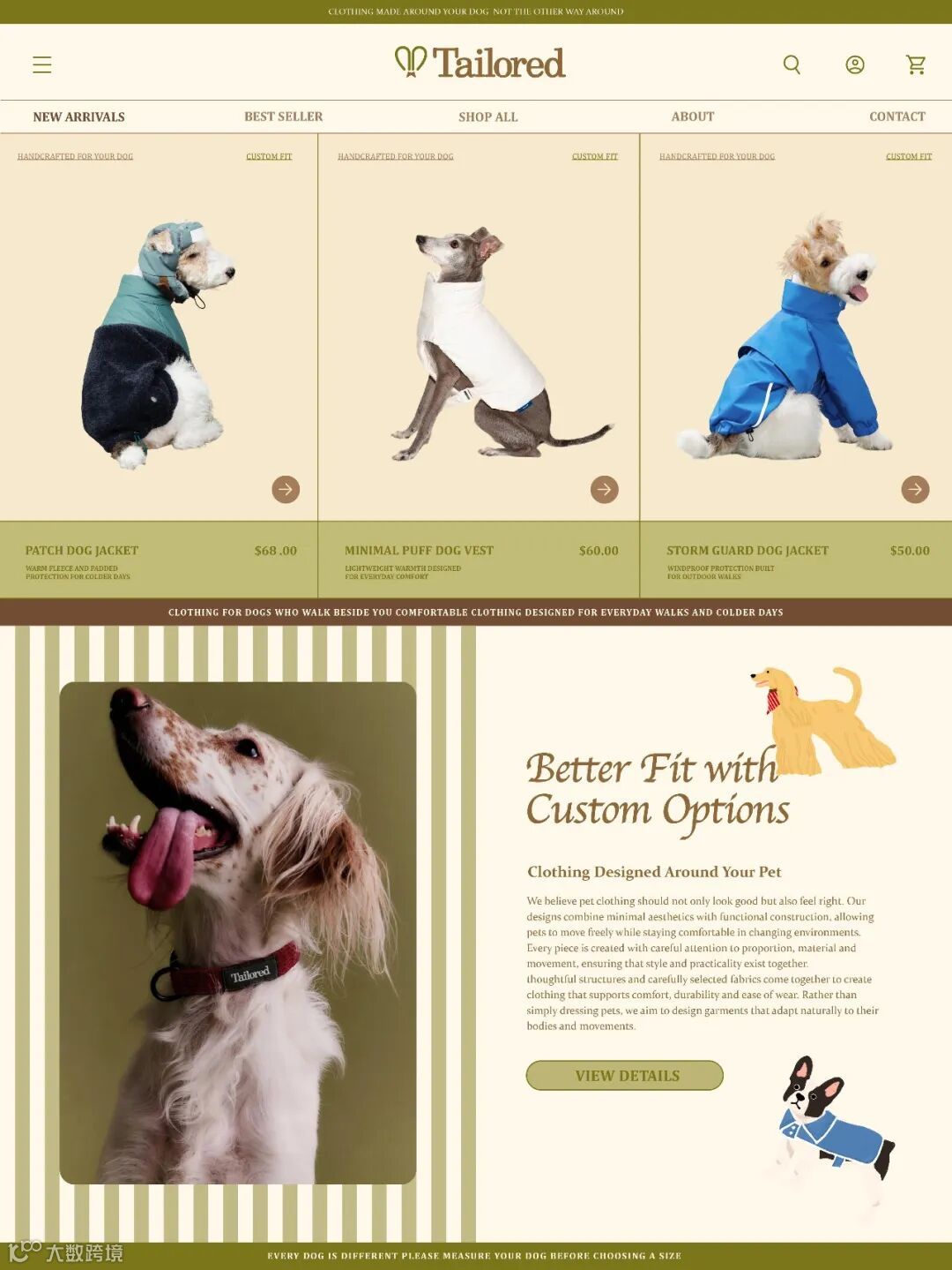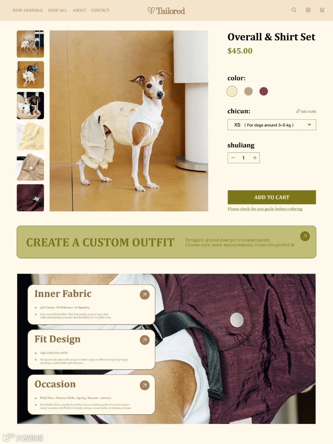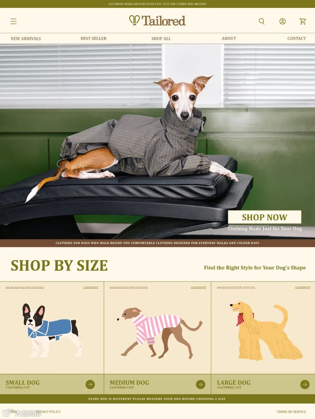 我们最近在复盘一个宠物服装品牌 Tailored 的独立站视觉思路时,对这一点感受特别深。这个项目最打动人的地方,不是把狗狗画得多可爱,而是它从一开始就没有把自己做成一个泛宠物品牌,而是在传递一个更明确的判断:今天的宠物,已经不只是宠物,而是家人;既然是家人,就不该再被一件通用尺码的衣服随便对待。