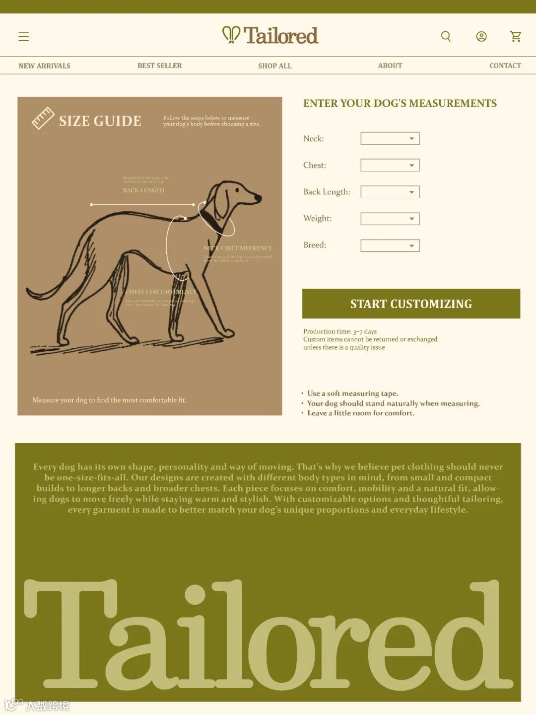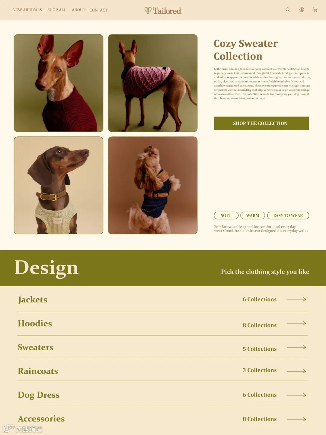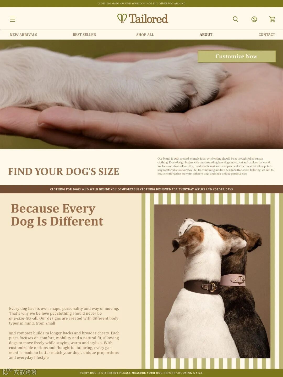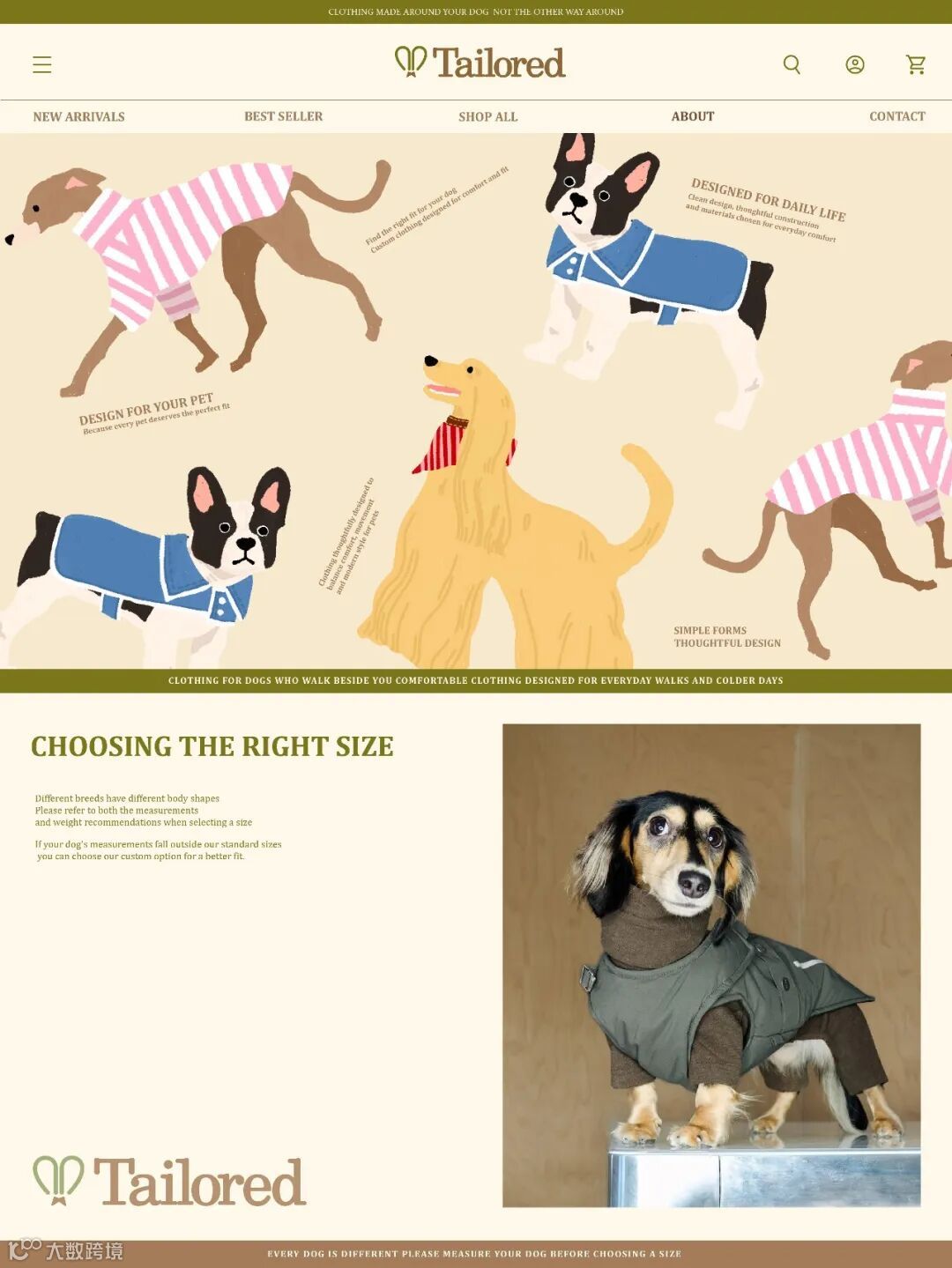 我们最近在复盘一个宠物服装品牌 Tailored 的独立站视觉思路时,对这一点感受特别深。这个项目最打动人的地方,不是把狗狗画得多可爱,而是它从一开始就没有把自己做成一个泛宠物品牌,而是在传递一个更明确的判断:今天的宠物,已经不只是宠物,而是家人;既然是家人,就不该再被一件通用尺码的衣服随便对待。