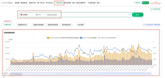另外再打开产品时光机功能,看季节款核心关键词近7天、1个月的热度变化曲线,热度的涨跌节点,还有去年同期的热度对比。今年这款的流量峰值时间、头部需求规模,基本上就能算得差不多,备货量也就有谱了。