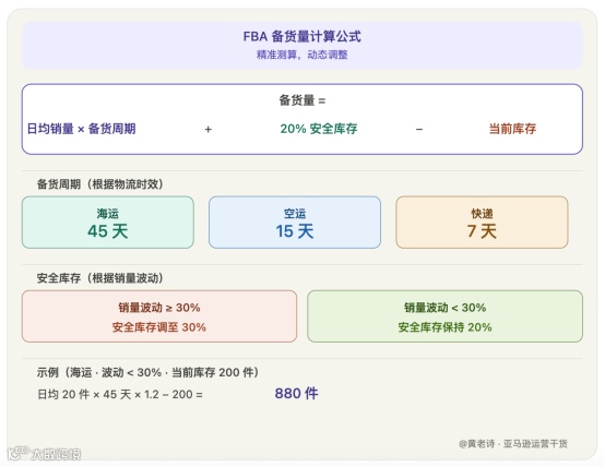 > 备货量 = 日均销量 × 45天(备货周期)+ 20%安全库存 − 当前库存