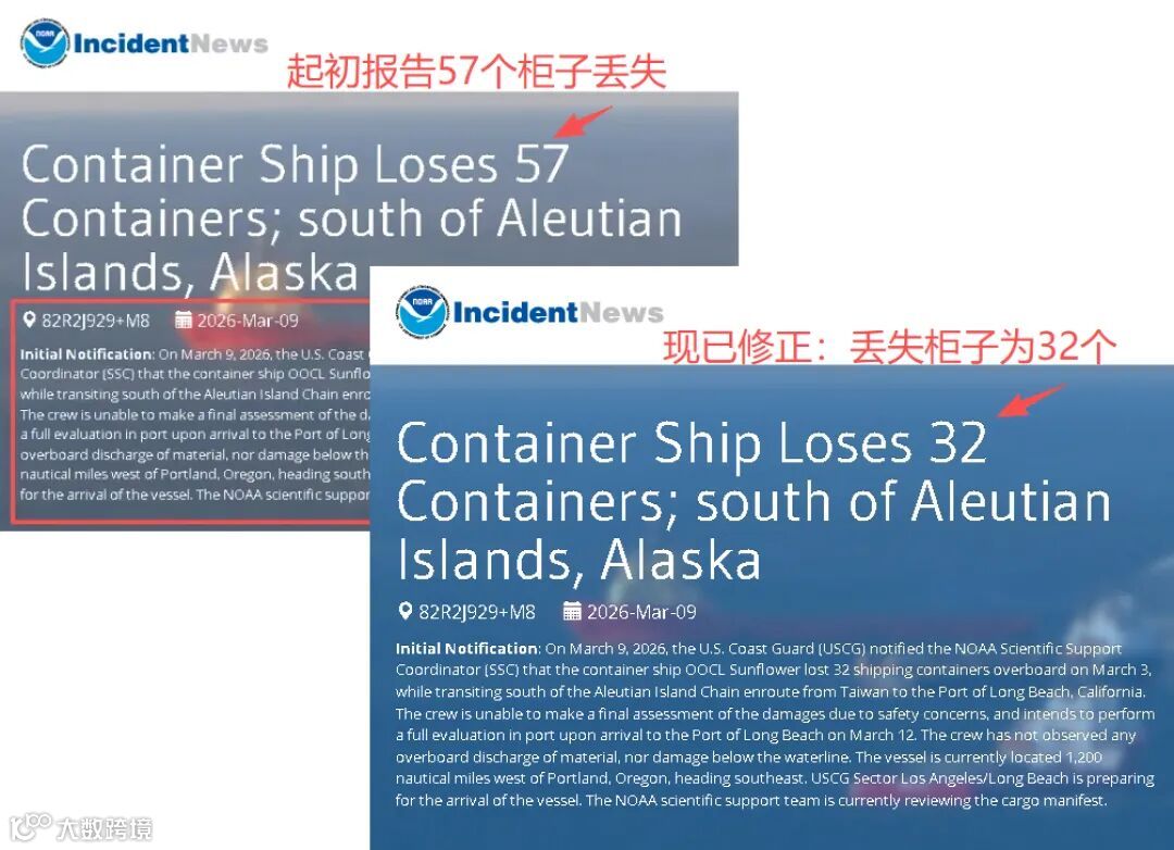 关键更正:货损数据更新,32柜落水、57柜受损