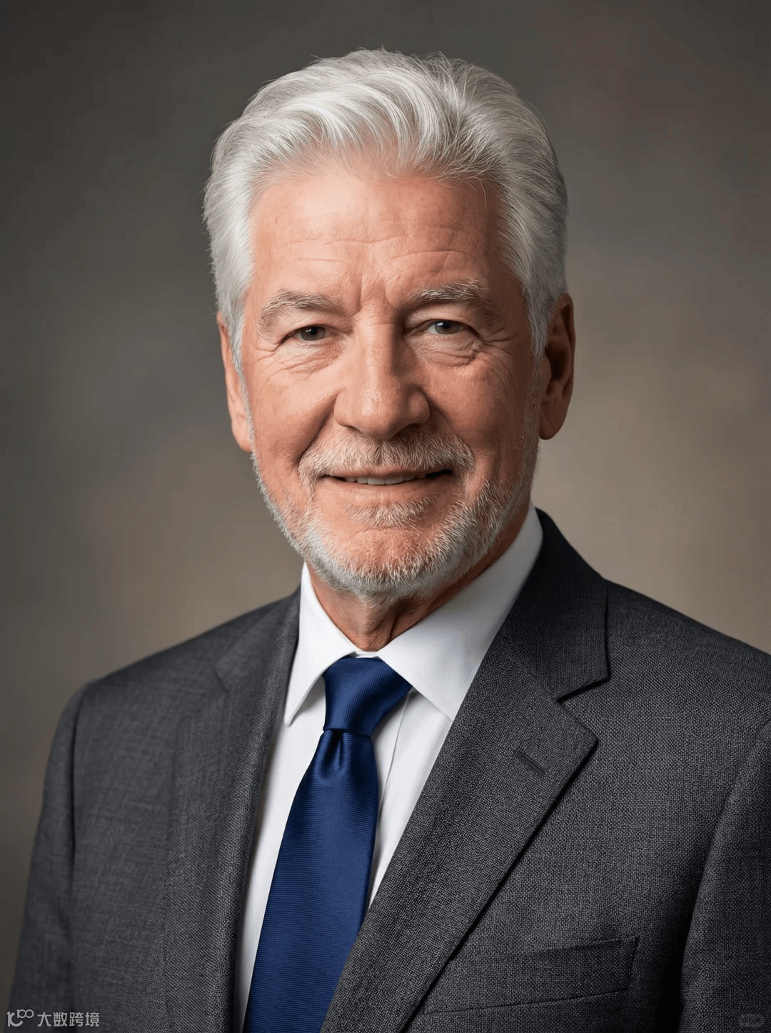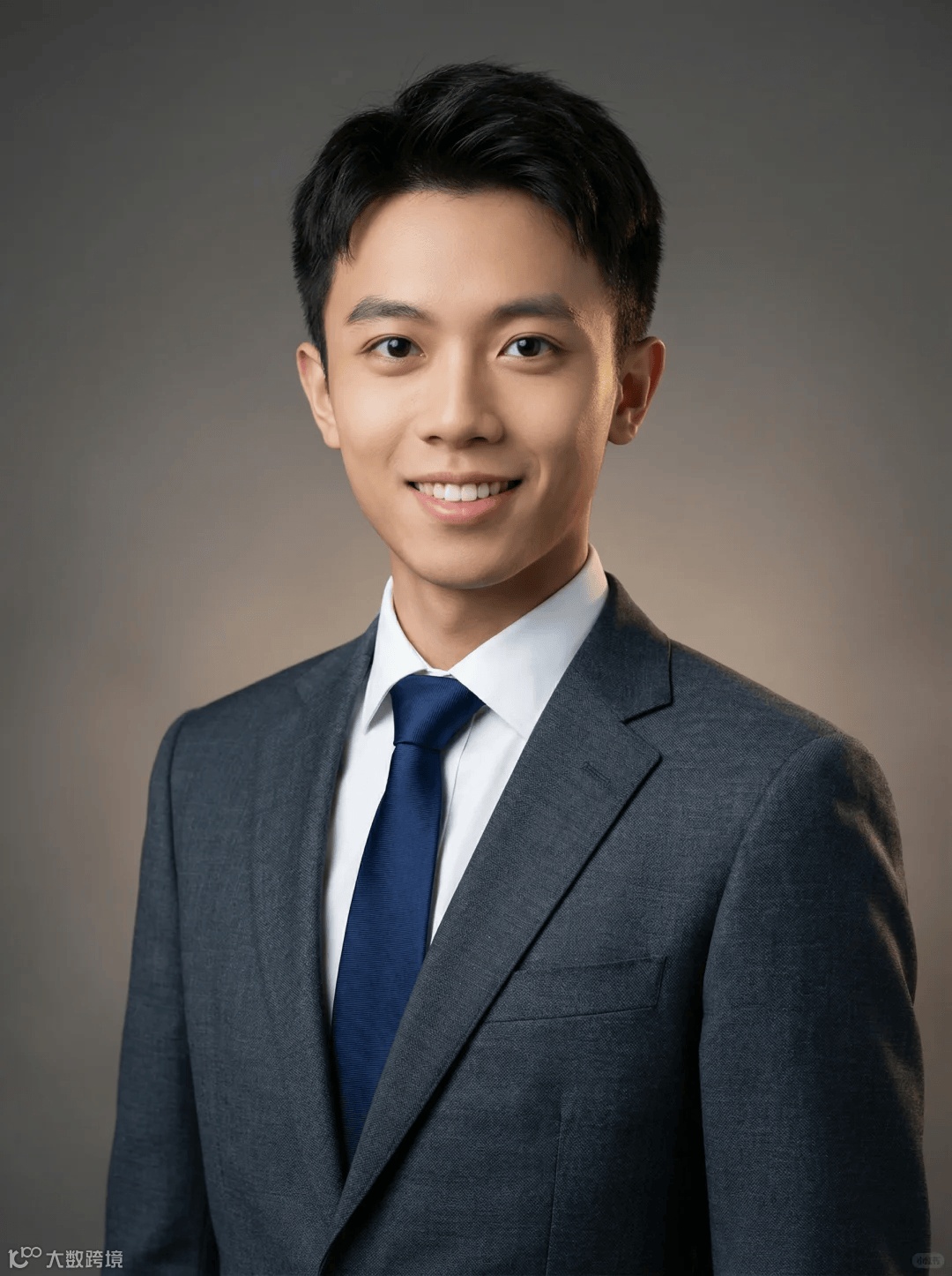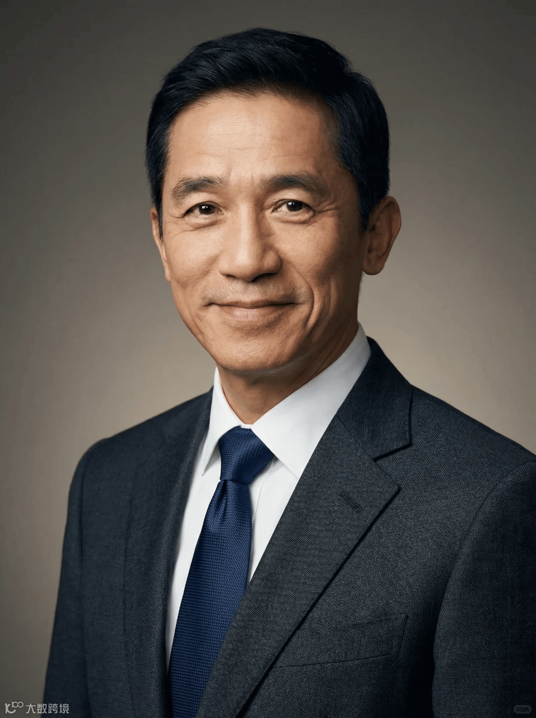 男士职业肖像提示词:根据上传图片制作专业工作室肖像摄影,焦点在于直视的目光和自信的微笑。保留面部结构、肤色、发型特征。人物身着裁剪考究的深灰色纹理西装、洁白的衬衫和领带。光线为柔和的工作室照明,主光从侧前方射入,营造深度和层次感。背景为平滑、虚化的中灰色到暖灰褐色渐变,确保焦点留在主体上。构图采用经典的头像和肩膀镜头,捕捉专业风采和权威感。高分辨率、超写实、细节清晰。
