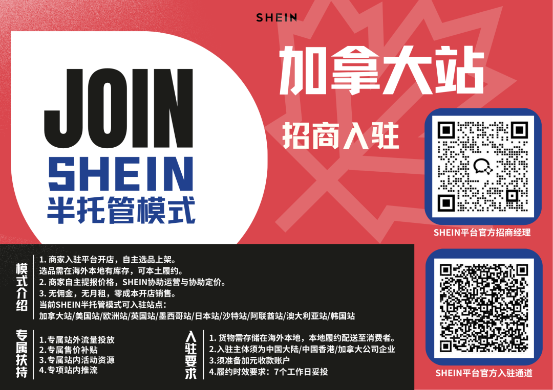 SHEIN 半托管加拿大站持续招商中。如果你正在寻找新的海外增长渠道,现在正是入局的窗口期。抓住平台流量红利,借助本地履约能力和平台协助运营,或许就是你打开加拿大市场的关键一步。