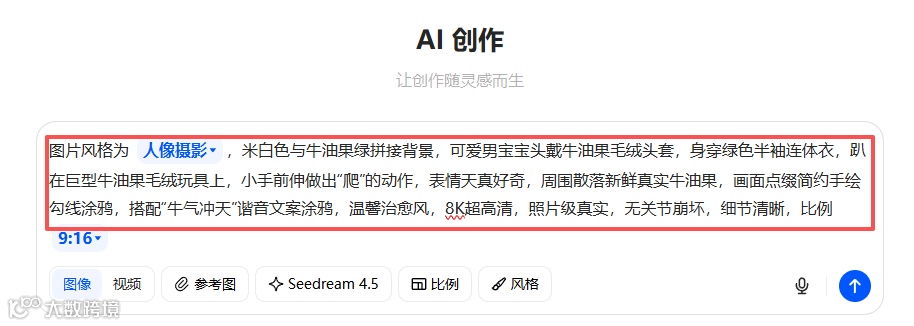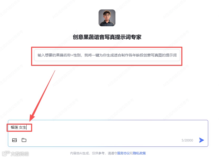 打开创意果蔬写真智能体,在对话框输入关键词并发送,即可生成提示词。