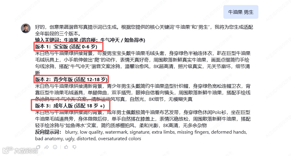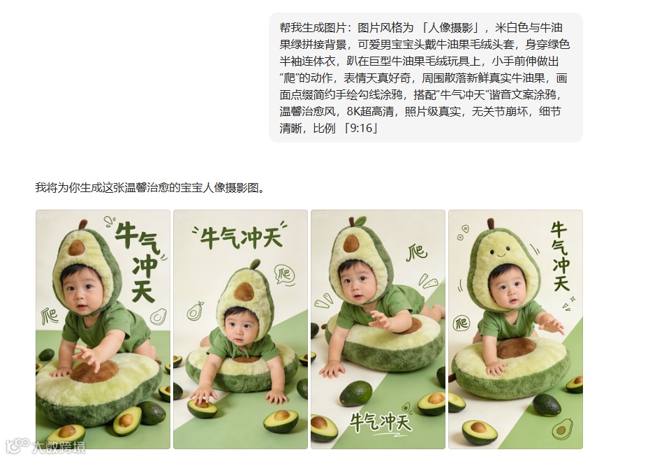 利用豆包 AI 一键制作创意水果写真,不仅出片效果出色,制作流程简单,还具备潜在的变现价值。以下展示通过该方法制作的宝宝版本与成年版本效果。