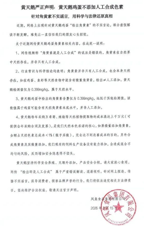 如果说胖东来是在“稳住阵脚”,合作方黄天鹅则选择了主动“反击”。品牌方解释角黄素广泛存在于自然界,检测数值属于天然范围,并对检测方法提出质疑,强调自身通过多项认证。