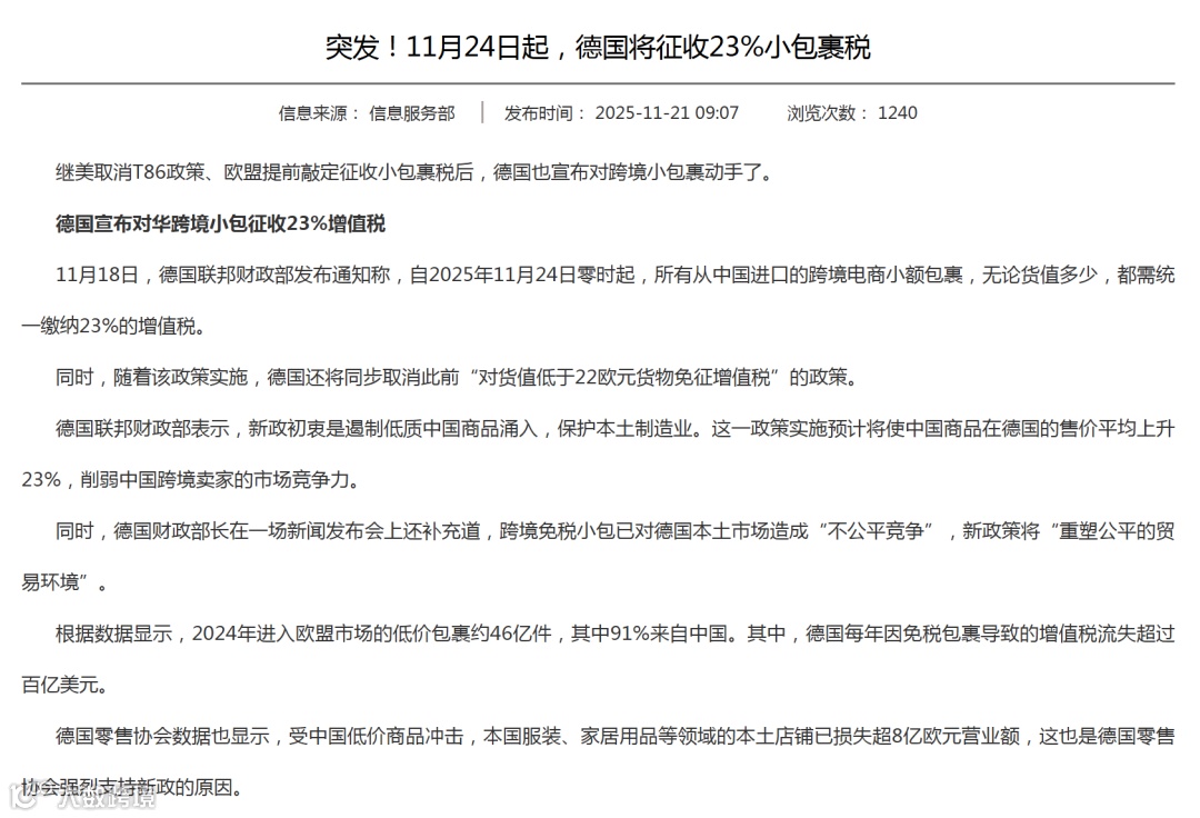 2026 年德国及欧盟的政策调整为跨境电商运营带来了新的合规挑战。德国自 2025 年 11 月 24 日起,对所有中国跨境电商小额包裹统一征收 23% 的增值税,取消了此前货值低于 22 欧元的免税政策。