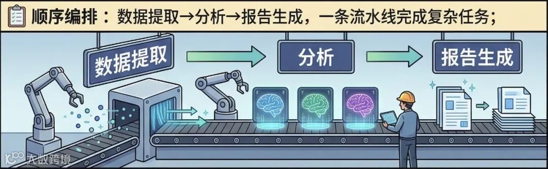 顺序编排:数据提取、分析、报告生成,一条流水线完成复杂任务。