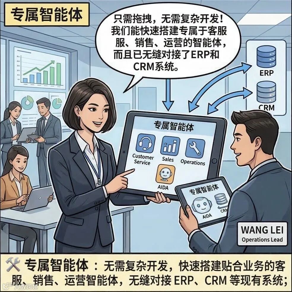 专属智能体:无需复杂开发,快速搭建贴合业务的客服、销售、运营方案,无缝对接现有业务系统。