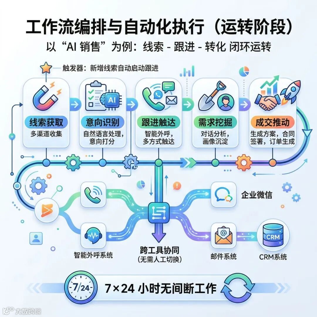 - 跨工具协同:自动调用外呼系统、通讯工具、邮件、客户关系系统等,实现闭环运转。