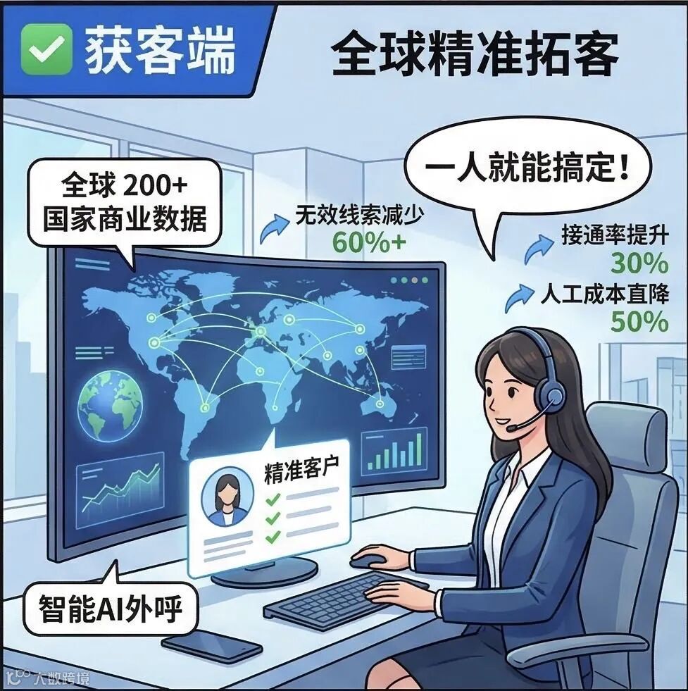 获客端:覆盖全球商业数据精准挖掘,无效线索显著减少,智能外呼接通率有效提升,人工成本大幅降低,一人即可完成传统团队的拓客闭环。