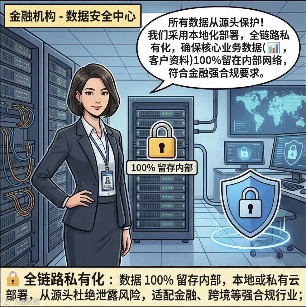 全链路私有化:数据完全留存内部,支持本地或私有云部署,从源头降低泄露风险,适配金融、跨境等强合规行业。