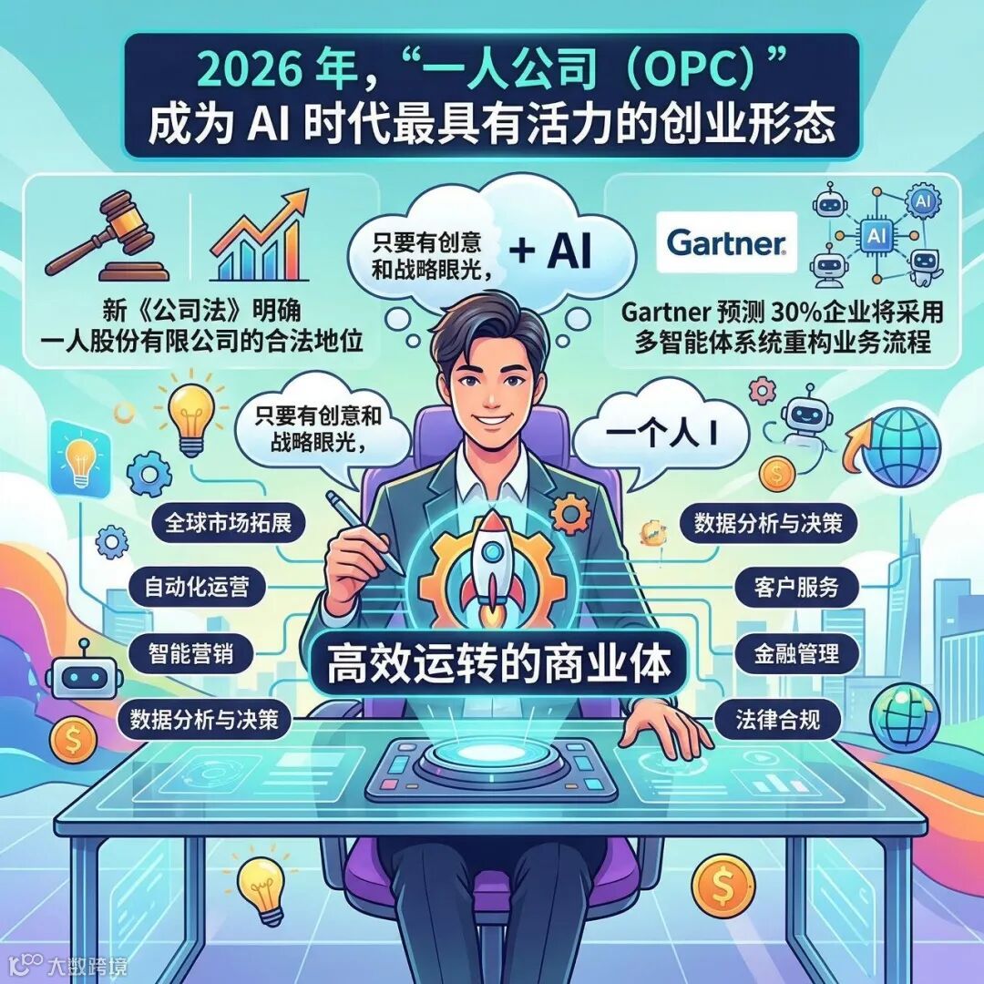2026 年,"一人公司(OPC)"不再是小众尝试,而是成为 AI 时代最具有活力的创业形态。新《公司法》明确一人股份有限公司的合法地位,行业分析机构预测 30% 企业将采用多智能体系统重构业务流程。