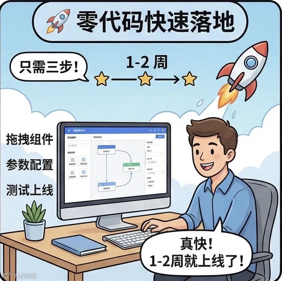 零代码快速落地:可视化配置界面,无需编程基础,通过"需求定义 - 参数配置 - 测试优化"三步即可上线,短时间完成定制,远快于传统开发周期。
