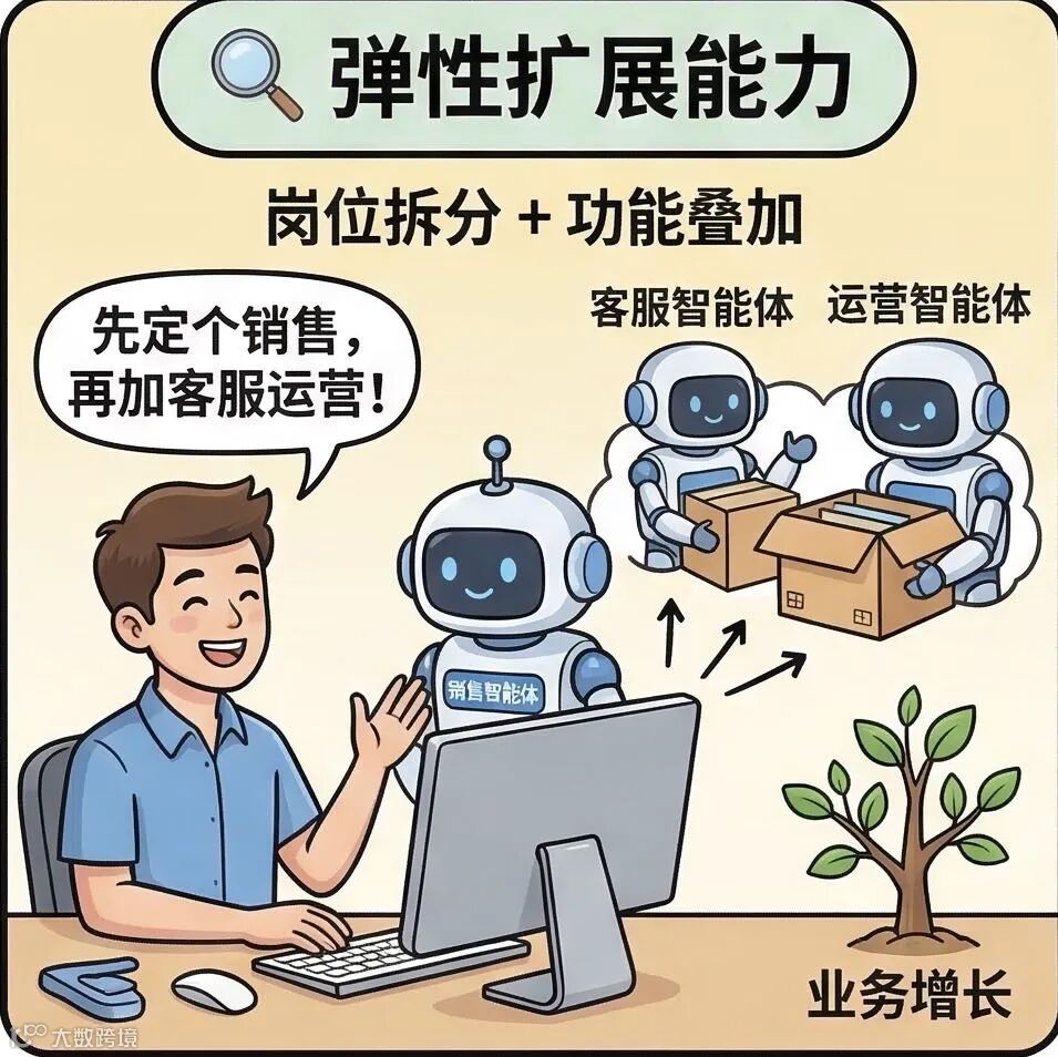 弹性扩展能力:支持"岗位拆分 + 功能叠加",一人公司可先定制核心岗位(如销售),后续按需添加客服、运营等角色,随业务增长灵活扩容。